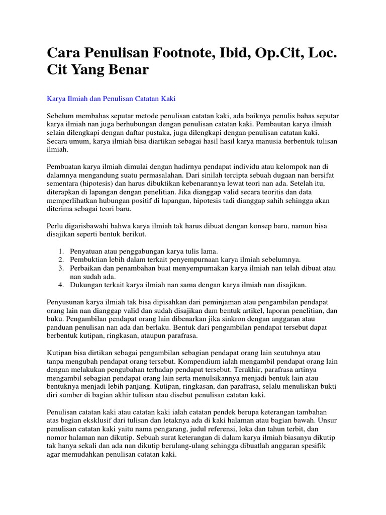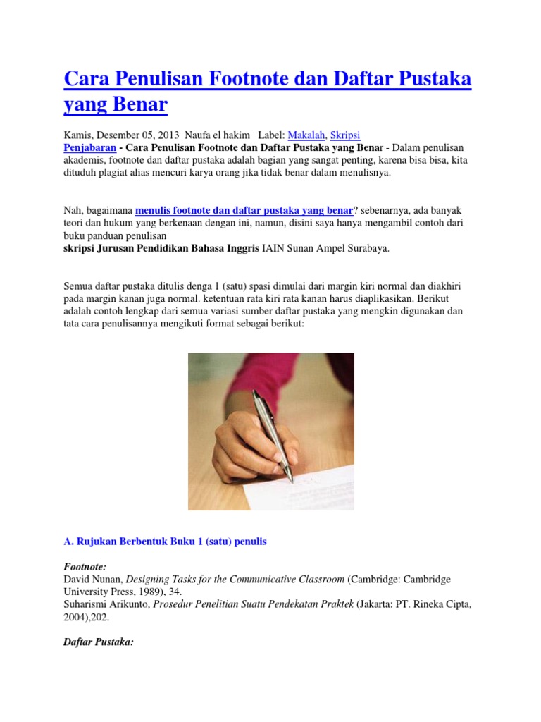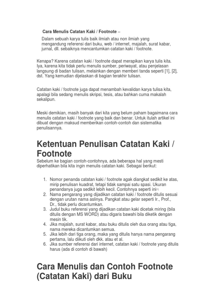 Penulisan daftar pustaka yang benar cara membuat contoh dalam penulisan sebuah karya ilmiah kita diharuskan untuk menyajikan suatu informasi dengan disertai sumber yang benar. Selain itu footnote memiliki fungsi seperti berfungsi sebagai sarana menerangkan sumber kutipan atau sebagai pedoman dalam penulisan daftar bacaan. Usahakan untuk melakukan parafrase atau mengubah struktur kalimat jika mengambil tulisan dari sumber lain.