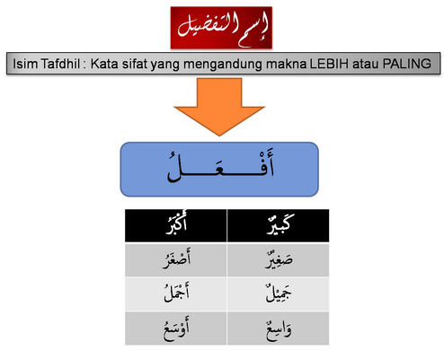 1 isim yang diawali dengan alif lam. ع ائ ش ة أ ك ب ر م ن ف اط م ة aa isyatu akbaru min faathimata aisyah lebih besar daripada fatimah. Pengertian isim tafdhil اسم التفضيل dalam ilmu nahwu wazan pola isim tafdhil syarat isim tafdhil kondisi isim tafdhil contoh kalimat isim tafdhil lengkap didalam al qur an اسم التفضيل هو ما يدل على أن شيئين اشتركا في صفة واحدة وزاد أحدهما على الآخر.