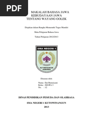 Pertunjukan wayang telah diakui oleh unesco pada tanggal 7 november 2003 sebagai karya kebudayaan yang mengagumkan dalam bidang cerita narasi dan warisan yang indah dan sangat berharga masterpiece of oral and intangible heritage of humanity. Makalah bahasa jawa 2012. Wayang suket biasanya dibuat sebagai alat permainan atau penyampaian cerita pewayangan kepada anak anak di desa desa jawa.