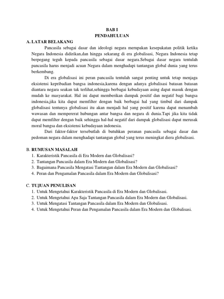 Globalisasi adalah suatu proses tatanan masyarakat yang mendunia dan tidak mengenal batas wilayah. Bab i pendahuluan 1 latar belakang pancasila sebagai dasar dan ideologi negara merupakan kesepakatan politik ketika negara indonesia didirikan dan hingga sekarang di era globalisasi negara indonesia tetap berpegang teguh kepada pancasila sebagai dasar negara sebagai dasar negara tentulah pancasila harus menjadi acuan negara dalam menghadapi tantangan global dunia yang terus berkembang. Boleh copas boleh di print dan lain lain haha.