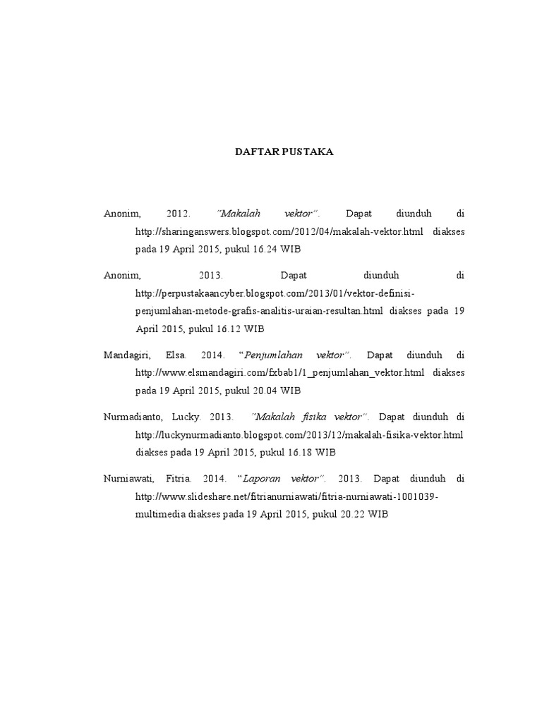 Daftar pustaka makalah vektor. Ini adalah contoh daftar pustaka makalah milik saya pribadi sebenarnya ini adalah daftar pustaka dari tugas akhir bukan makalah. Puji syukur penulis panjatkan kepada allah swt yang telah memberikan kepada kita semua rahmat dan karunia nya shalawat dan salam selalu tercurahkan kepada junjungan kita nabi besar muhamad saw karena atas izin nya penulis dapat menyelesaikan makalah yang berjudul vektor sebagai penular penyakit makalah ini disusun untuk memenuhi salah satu tugas mata kuliah mikrobiologi. Vektor vektor hasil penguraian inilah yang disebut dengan vektor komponen.