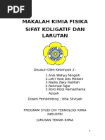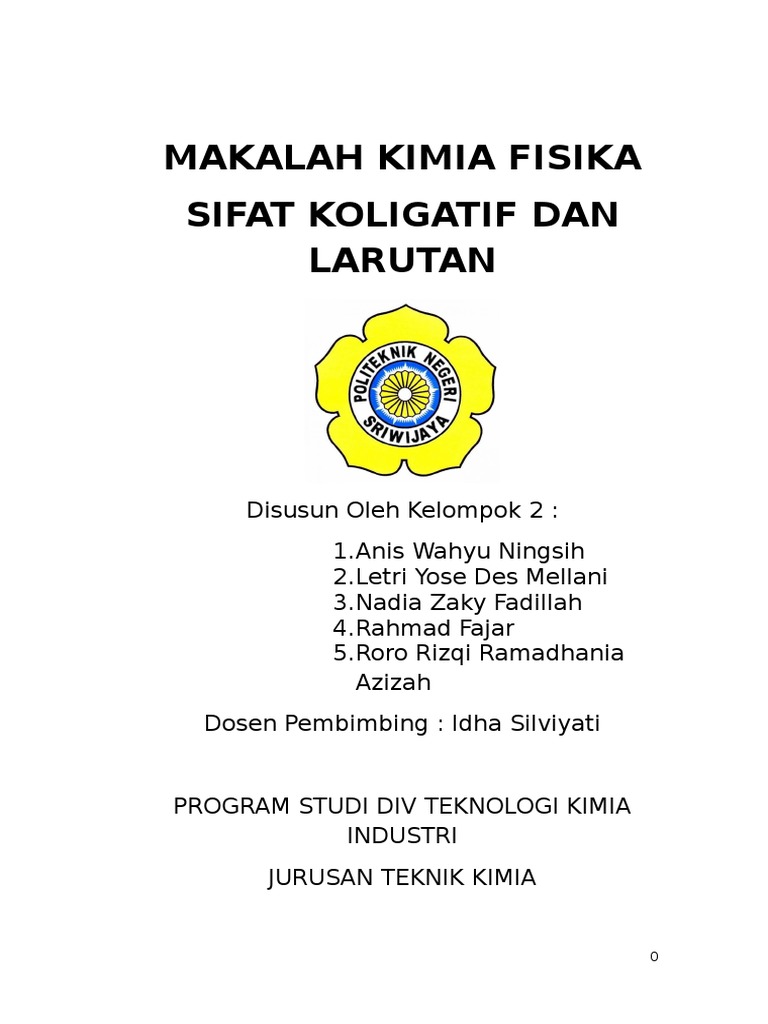 Kata pengantar makalah kimia sifat koligatif larutan. Pada kondisi ini memiliki potensial kimia yang sama atau dengan kata lain tingkat energi kedua fasa adalah sama. Sifat koligatif larutan adalah sifat larutan yang hanya dipengaruhi oleh jumlah partikel zat terlarut di dalam larutan dan tidak dipengaruhi oleh sifat dari zat terlarut. Nanang wijaya 4301415012 jurusan kimia fakultas matematika dan ilmu pengetahuan alam universitas negeri semarang 2016 kata pengantar puji syukur kehadirat allah swt atas tersusunnya makalah larutan.