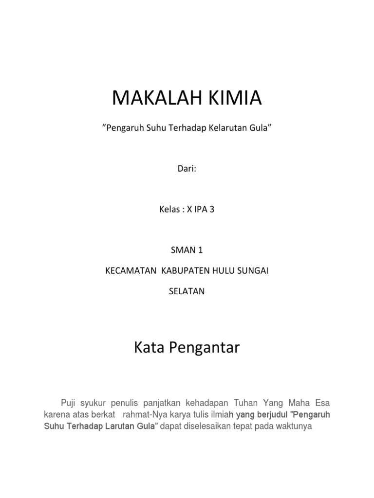 Shalawat dan salam selalu tercurahkan kepada rasulullah saw. Kata pengantar dengan penuh rasa syukur kepada tuhan yang maha esa yang telah memberikan karunia akal pikiran ketabahan keuletan kesabaran dan keteguhan hati akhirnya saya dapat memulai. Puji syukur kita panjatkan kehadirat allah swt karena dengan rahmat dan karunianya sehingga makalah kimia dasar tentang kelarutan dapat diselesaikan.