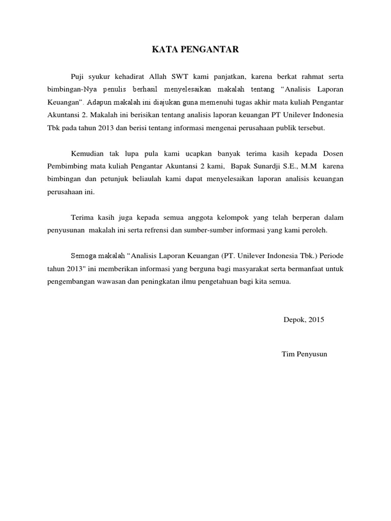 Kata pengantar makalah laporan keuangan. Laporan keuangan yang merupakan hasil dari kegiatan operasi normal perusahaan akan memberikan informasi keuangan yang berguna bagi entitas entitas di dalam perusahaan itu sendiri maupun entitas entitas lain di luar perusahaan oleh. Contoh kata pengantar laporan baik laporan praktek lapangan kerja study tour atau contoh kata pengantar makalah skripsi dan tesis akan dijelaskan dalam artikel ini. Bagi para analis laporan keuangan merupakan media yang penting untuk menilai prestasi dan kondisi ekonomi suatu perusahaan dan laporan keuangan juga menjadi bahan sarana informasi bagi para analis dalam proses pengambilan keputusan karena laporan keuangan dapat menggambarkan posisi keuangan perusahaan hasil usaha perusahaan dan arus kas perusahaan dalam periode tertentu.