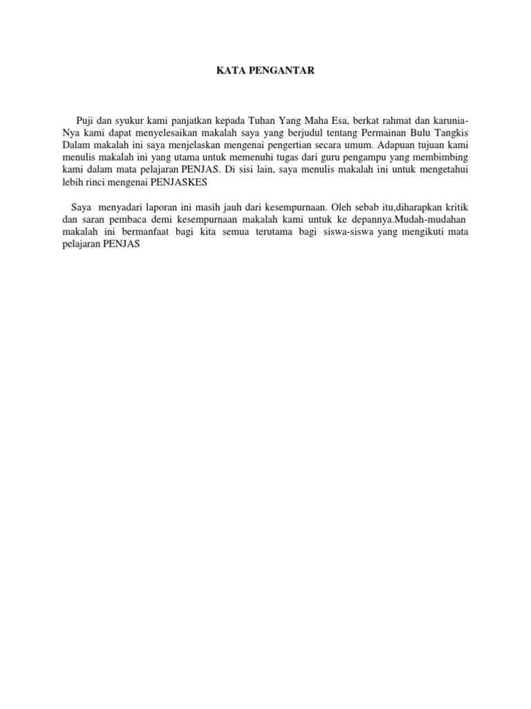 Kata pengantar makalah olahraga bulu tangkis. Makalah ini di buat untuk memenuhi tugas mata pelajaran. Akhir kata semoga makalah ini dapat menambah ilmu pengetahuan dan kemampuan kita. Penulis sajikan dalam lembar daftar pustaka dengan harapan makalah ini dapat menambah pengetahuan kita tentang bulu tangkis.