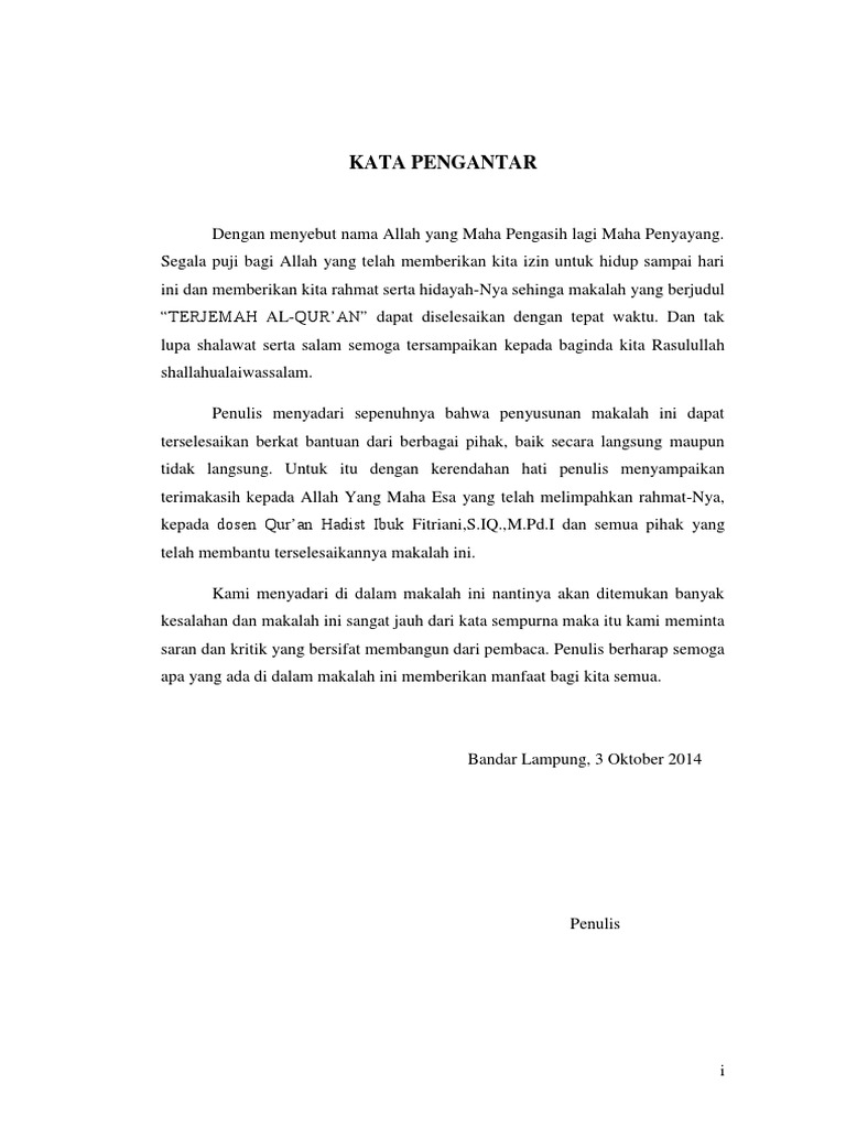 Kami menyadari bahwa dalam penulisan makalah ini masih banyak terdapat kesalahan dan kekhilafan maka dengan hal itu kami sangat mengharapkan kritik dan saran dari semua pihak s ehingga ke depan dapat menjadi koreksi untuk kemajuan dan lebih baik demi penyempurnaan makalah ini. Segala puji bagi allah yang telah memberikan kita izin untuk hidup sampai hari ini dan memberikan kita rahmat serta hidayah nya sehinga makalah yang berjudul terjemah al quran dapat diselesaikan dengan tepat waktu. Kata pengantar bismillahir rahmanir rahimpuji dan syukur kita panjatkan kepada allah swt tuhan semesta alam.