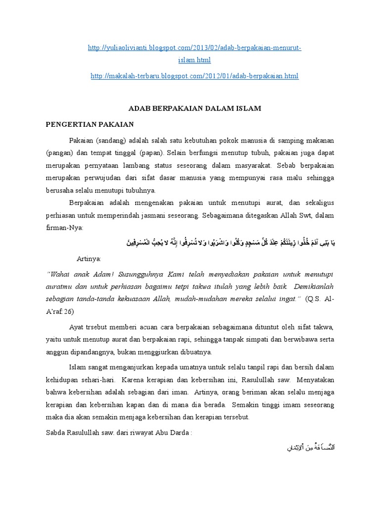 Makalah adab berpakaian dalam islam. Bentuk perhiasan seperti ini umumnya dikaitkan dengan wanita namun pada hari ini ramai antara para lelaki cenderung untuk berhias seperti wanita sehingga ada yang sanggup bersubang dan berantai. Dalam makalah ini akan dijelaskan secara rinci tentang berpakaian sesuai syariat islam serta azab bagi yang tidak mengikuti ajaran berpakaian sesuai syariat islam. 1 menutup aurat.