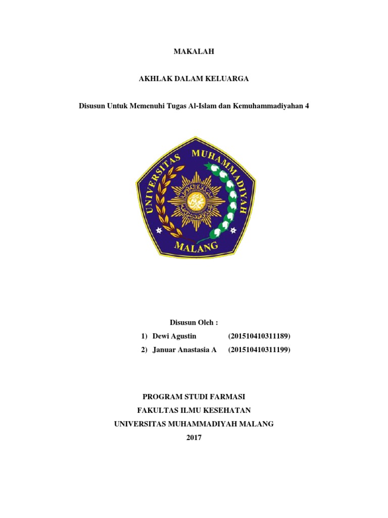 Makalah akhlak dalam keluarga ditulis untuk memenuhi tugas al islam dan kemuhammadiyahan oleh. Apalagi dalam keluarga luas extended family kakek nenek paman bibi bahkan pembantu rumah tangga pun turut serta bergajul dengan anak mereka juga akan turut mempengaruhi atau mendidik anak. Beliau adalah orang terpilih untuk dijadikan panutan bagi umat manusia.