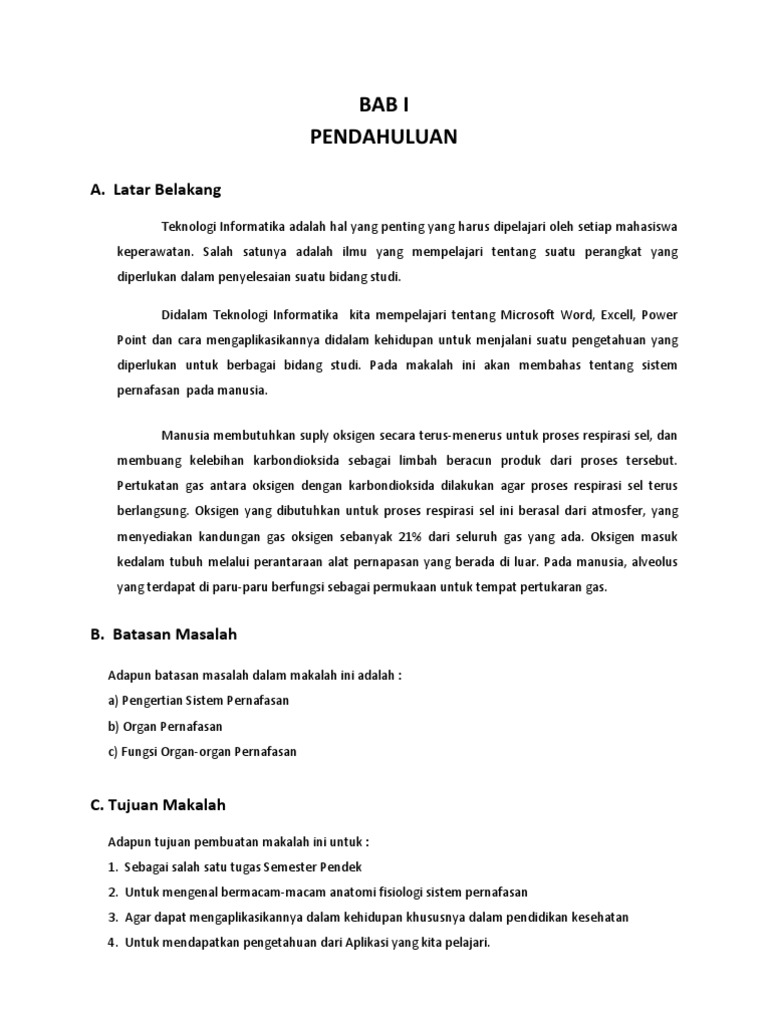 Makalah anatomi fisiologi sistem pernapasan. Makalah ini di susun dengan bahasa yang sederhana berdasarkan berbagai literatur tertentu dengan tujuan untuk mempermudah pemahaman mengenai teori yang. Makalah merupakan sebuah karya akademis yang diterbitkan didalam jurnal ilmiah dimana membahas. Pernapasan adalah proses ganda yaitu terjadinya pertukaran gas di dalam jaringan atau pernapasan dalam dan yang terjadi didalam paru paru pernapasan luar.