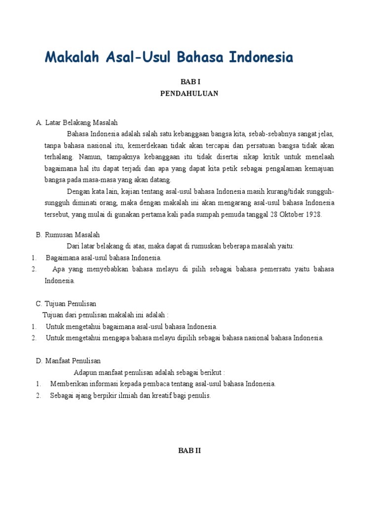 Makalah asal usul bahasa indonesia. Asal usul sejarah bahasa indonesia masa lalu sebagai bahasa melayu. Bahasa indonesia itu pada umunya berasal dari bahasa melayu pada zaman sebelumnya lebih tepatnya pada dizaman kerajaan sriwijaya bahasa melayu itu banyak digunakan ialah sebagai bahasa penghubung antar suku pada plosok nusantara. Begitu juga dengan bahasa indonesia.