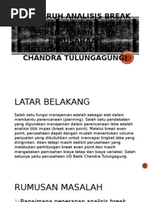 Munawir 1986 break even point adalah titik produksi dimana hasil penjualan sama persis dengan total biaya produksi. Dan apabila titik tersebut kita tarik garis lurus vertikal ke bawah sampai sumbu x akan nampak besarnya break even dalam unit. Bab i pendahuluan 1 1 latar belakang sebelum memproduksi suatu produk perusahaan terlebih dulu merencanakan seberapa besar keuntungan yang diinginkan.