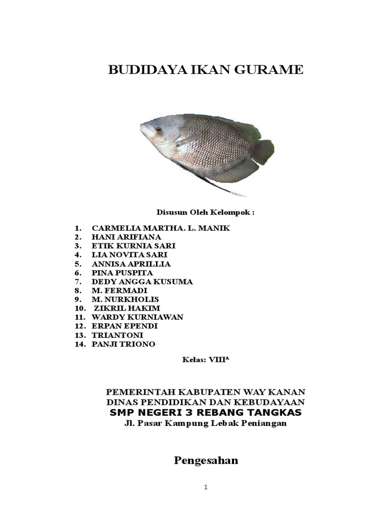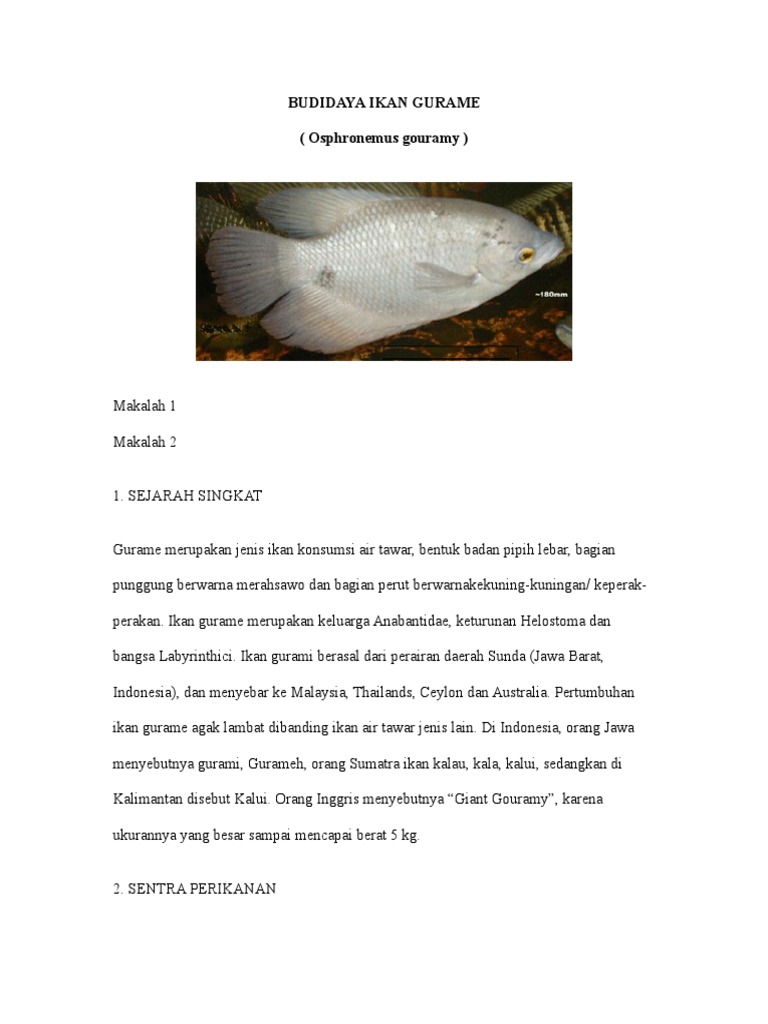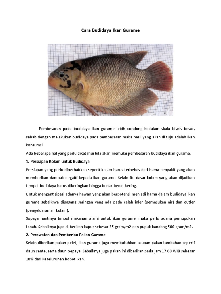 Makalah budidaya ikan konsumsi gurame. Cara budidaya ikan gurame ikan gurame atau ikan gurami osprhronemus gouramy lac termasuk ikan air tawar yang tersebar di kawasan asia tenggara di indonesia ikan gurame menjadi ikan konsumsi terfavorit karena rasanya yang lezat. Ikan konsumsi dapat diperoleh salah satunya dari proses budidaya. Dilihat dari jenis pemangsa air menurut heinz dan kline 1973 musuh utama ikan gurame terbagi atas ikan liar pemangsa dan beberapa jenis ikan pemelihara.