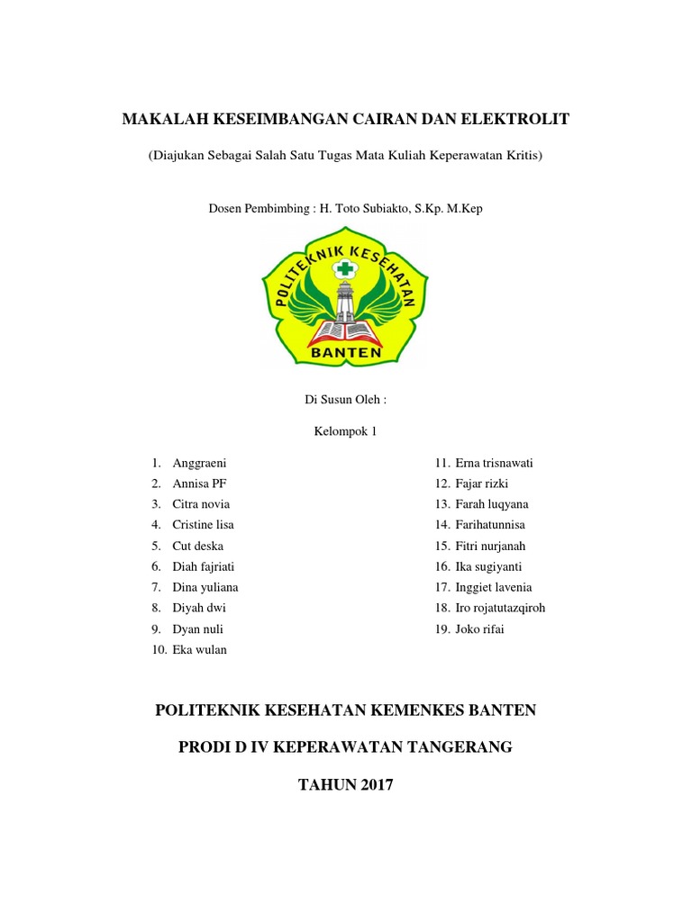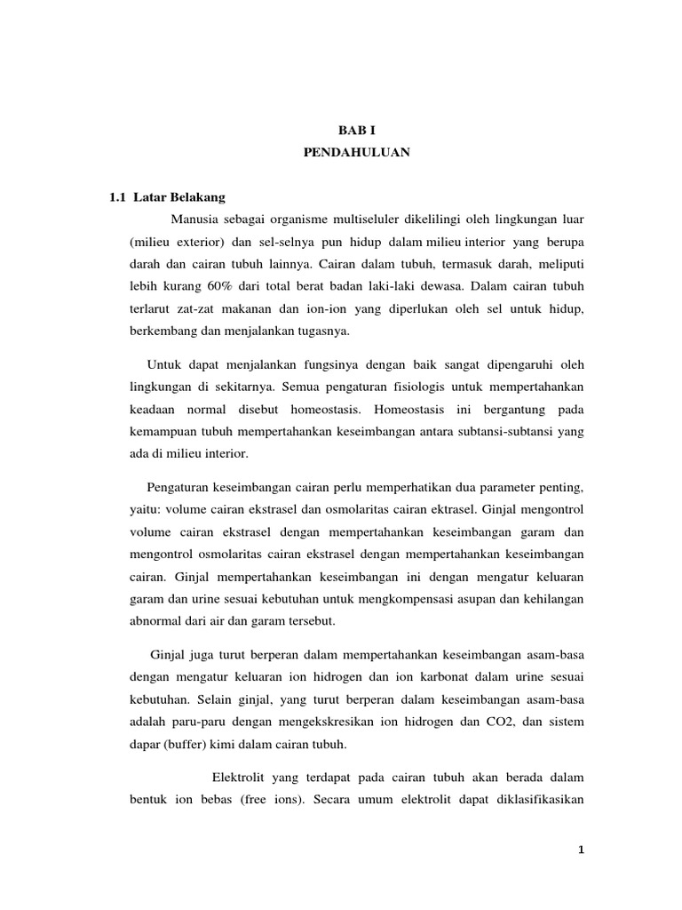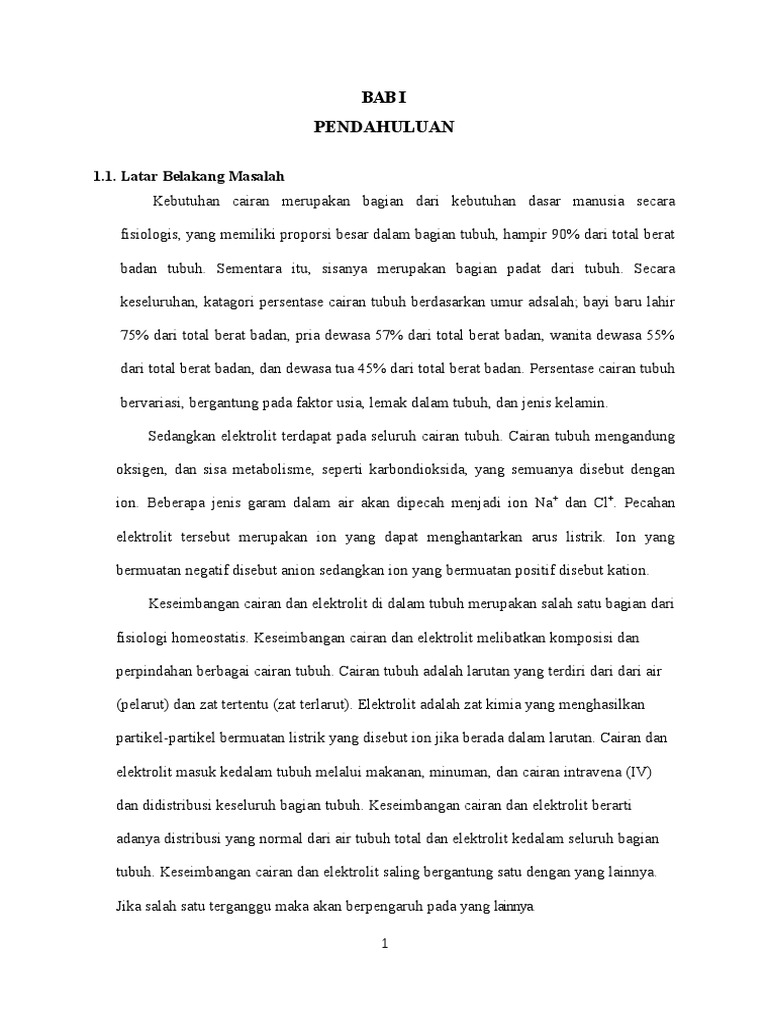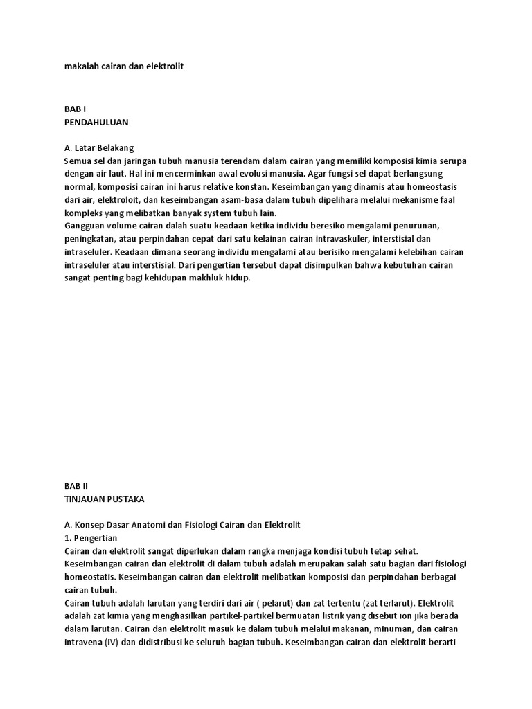 Makalah cairan dan elektrolit dalam tubuh manusia bab i. Cairan dan elektrolit sangat penting untuk memoertahankan keseimbangan atau homeostasis tubuh. Cairan dan elektrolit sangat diperlukan dalam rangka menjaga kondisi tubuh tetap sehat.