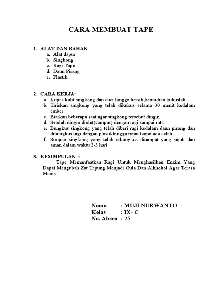 Makalah cara membuat tape singkong. Di kota kota besar di seluruh indonesia tape singkong biasanya dijual oleh penjual keliling dengan menggunakan gerobak dan lebih populer dengan sebutan tape singkong saja. Resep cara membuat tape singkong salah satu cemilan tradisional hasil fermentasi ala indonesia. Ciri khasnya yaitu rasa yang manis tekstur yang lembut serta aromanya yang harum.