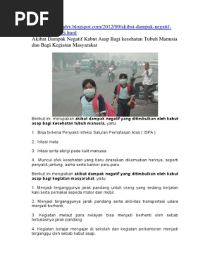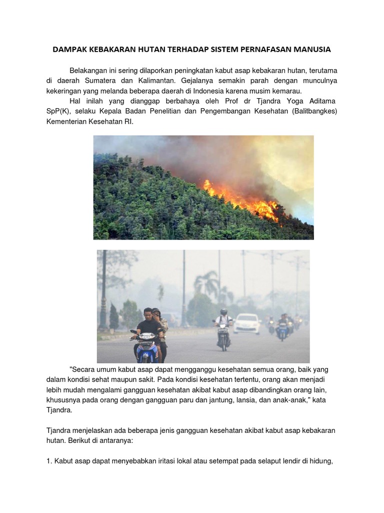 Dampak langsung terhirupnya asap kebakaran hutan dan lahan adalah infeksi saluran pernapasan atas sedangkan dampak tidak langsungnya adalah munculnya penyakit pada sistem otot dan jaringan pengikat jika penutupan asap kebakaran hutan berlangsung dalam periode yang cukup panjang. Kebakaran hutan dan lahan di indonesia terjadi hampir. Pengaruh asap terhadap kesehatan terjadi melalui berbagai.