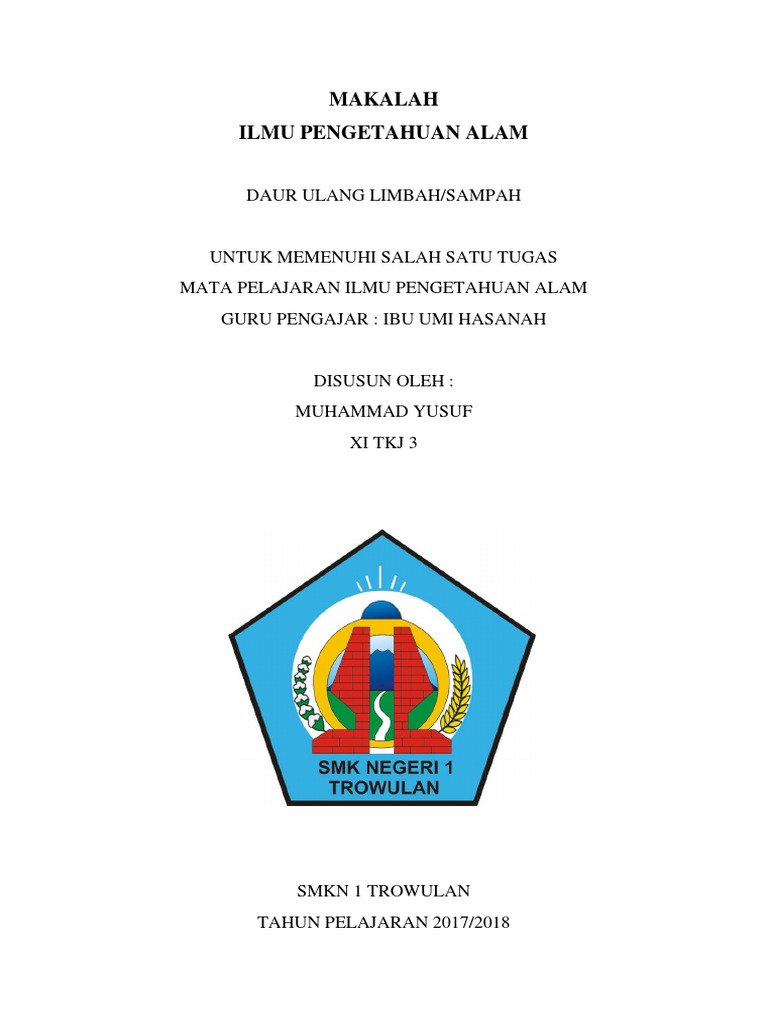 Makalah daur ulang sampah. Mendaur ulang 1 ton kertas koran akan menyelamatkan 17 pohon dan menggunakan kertas daur ulang dapat mengurangi 74 pencemaran udara 34 pencemaran air dan menghemat energi hingga 67. Usaha daur ulang sampah anorganik seperti kaca plastik kertas koran kaleng besi dapat mengurangi tumpukan sampah kota hingga 25. Academia edu is a platform for academics to share research papers.
