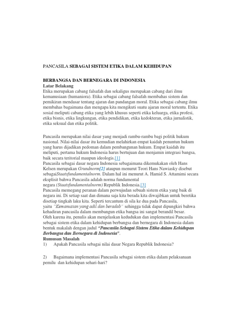 Etika dan moral sama artinya tetapi pemakaiannya dalam sehari hari terdapat sedikit perbedaan. Etika dalam kehidupan berbangsa dan bernegara berdasarkan pancasila 2. Kata pengantar puji syukur kita panjatkan kepada allah swt yang telah memberikan rahmat serta karunia nya sehingga kita dapat menyelsaikat pembuatan makalah pendidikan kewarganegaraan yang berjudul pancasila sebagai sumber etika dalam kehidupan berbangsa dan bernegara dalam rangka memenuhi tugas mata kuliah pendidikan kewarganegaraan dari dosen pengampu bapak azwar subandi s p mh.