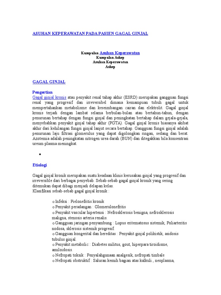 Kumpulan makalah terbaru untuk gratis dan terbaru. Latar belakang ginjal merupakan organ penting dalam tubuh dan berfungsi untuk membuang sampah metabolisme dan racun tubuh dalam bentuk urin yang kemudian dikeluarkan dari tubuh. Gagal ginjal kronik disebabkan oleh hilangnya sejumlah besar nefron fungsional yang progresif dan ireversible guyton hall 2007 426.