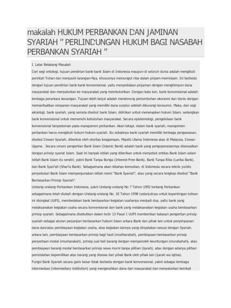 Makalah hukum perbankan syariah. Mengingatkan terkadang margin yang di berikan perbankan syariah bagi produk jual beli cukup tinggi karna besaranya yang mirip dengan intrest rate. Masalah tentang perbankan syariah dalam artian bank tanpa bunga atau bank dengan prinsip perjanjian bagi hasil sudah mulai diperkenalkan di negara kita sejak awal tahunan 1990 an. Pada dasarnya sepintas dari segi tujuan produk pembiayaan yang dilakukan pihak perbakan konvensional dan perbankan syariah memiliki persamaan yaitu melakukan pembiayaan atas barang atau jasa yang di kehendaki oleh nasabah dengan tujuan memperoleh keuntungan yang hanya dikehendaki pihak perbankan.