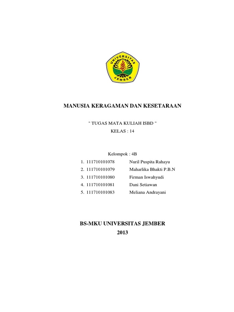Tugas ilmu sosial dan budaya dasar makalah ini diajukan untuk memenuhi tugas mata kuliah ilmu sosial dan budaya dasar pengampu. Dian tri prasetyowati a210120103 pendidikan akuntansi fakultas keguruan dan ilmu pendidikan universitas muhammadiyah surakarta 2012 ruang lingkup isbd 1. Makalah ini berisikan tentang informasi pengertian keragaman danb kesetaraan atau yang lebih khususnya membahas manusia sebagai makhuk keragaman dan kesetaraan faktor faktor yang mempengaruhi keragaman.