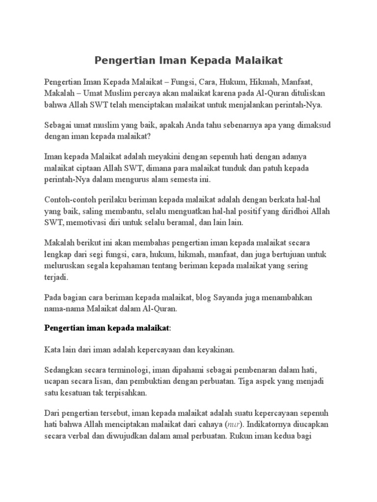 Makalah iman kepada allah dan malaikat. Puji dan syukur penyusun panjatkan kehadirat allah swt yang telah memberikan rahmat dan hidayah nya kepada penulis sehingga makalah yang berjudul iman kepada kitab kitab allah swt dapat tersusun dengan baik dan dapat disajikan dengan baik. Sma negeri 1 sidayu disebutkan malaikat ridwan bertugas. Rukun akidah yang kedua setelah iman kepada allah adalah iman kepada adanya malaikat.