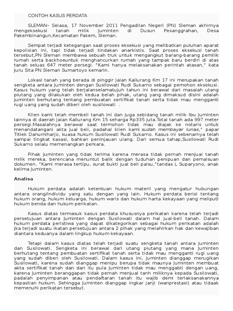 Makalah kasus hukum perdata. Dengan menyelesaikan makalah ini semoga dapat berguna bagi para pembaca serta teman teman sekalian. Hukum perdata indonesia merupakan hukum perdata milik bangsa indonesia yang berinduk pada kitab undang undang hukum perdata kuhpdt atau burgerlijk wetboek bw. Pemahaman yang keliru terhadap kasus hukum perdata akan membuat kita mengambil langkah yang keliru pula dalam upaya penyelesaiannya.