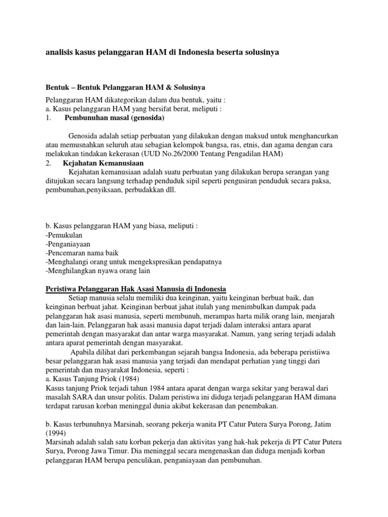 Dalam kasus pelanggaran ham berat ini bahwa pada pasal 9 uu no 26 tahun 2000 unsur kejahatan manusia dan juga mengandung unsur pelanggaran hak asasi manusia. Marsinah merupakan salah satu penggerak unjuk rasa di pt. Salawat serta salam semoga tercurahkan kepada kekasih allah yang memiliki akhlak paling mulia yaitu nabi muhammad saw.