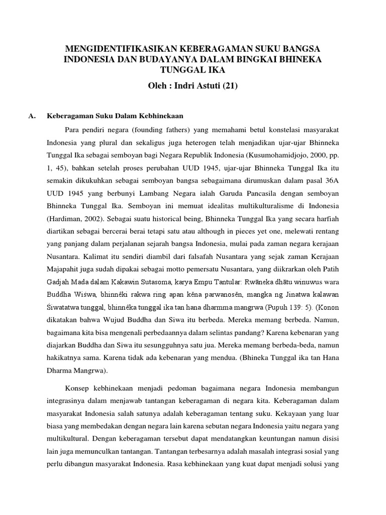 Andreas p 094284036 jurusan pendidikan sejarah fakultas ilmu sosial universitas negeri surabaya 2013 kata pengantar puji syukur kehadirat allah swt yang telah melimpahkan rahmat taufik serta hidayahnya sehingga penulis dapat menyelesaikan makalah dengan judul bhineka tunggal ika tepat pada waktu yang telah ditentukan makalah. Dikutip dari situs resmi kementerian pendidikan dan kebudayaan republik indonesia berikut ini penjelasan mengenai. Perbedaan dalam masyarakat merupakan keberagaman indonesia yang dapat dirangkai dalam bingkai bhinneka tunggal ika.