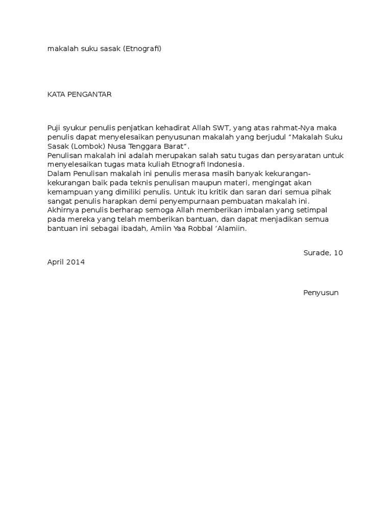 Makalah suku sasak minggu 23 september 2012. Contoh makalah ilmu pengetahuan sosial kata pengantar puji syukur kehadirat tuhan yang maha esa atas segala rahmat dan hidayah nya sehingga makalah ini dapat disusun hingga selesai dengan lancar. Makalah suku sasak makalah ini dibuat untuk memenui tugas isbd prodi d3 kebidanan kelas b.