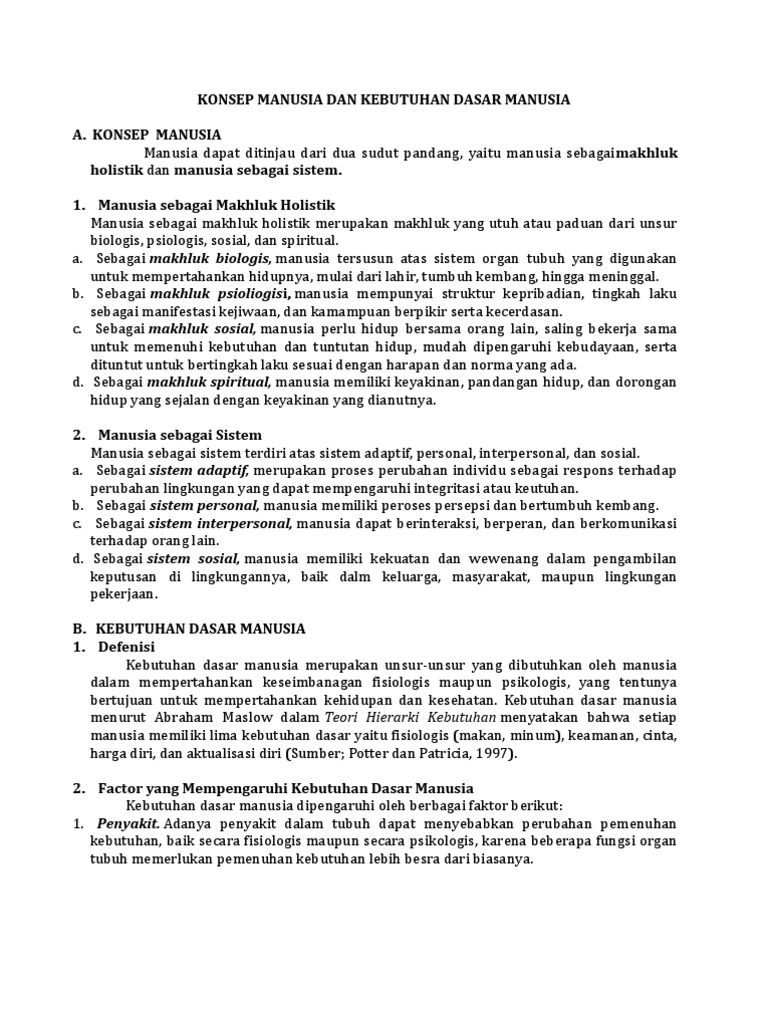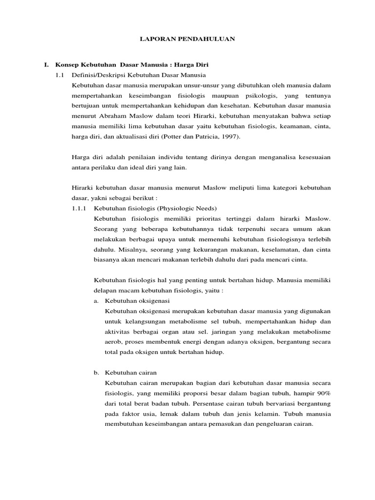 Kebutuhan dasar manusia menurut abraham maslow dalam teori hirarki menyatakan bahwa setiap manusia memiliki lima kebutuhan dasar yaitu kebutuhan fisiologis keamanan cinta harga diri dan aktualisasi diri potter dan patricia 1997. Kebutuhan dasar manusia merupakan unsur unsur yang dibutuhkan oleh manusia dalam menjaga keseimbangan baik secara fisiologis maupun psikologis yang bertujuan untuk mempertahankan kehidupan dan kesehatan. Menurut teori ini beberapa kebutuhan manusia tertentu lebih dari pada kebutuhan lainnya.