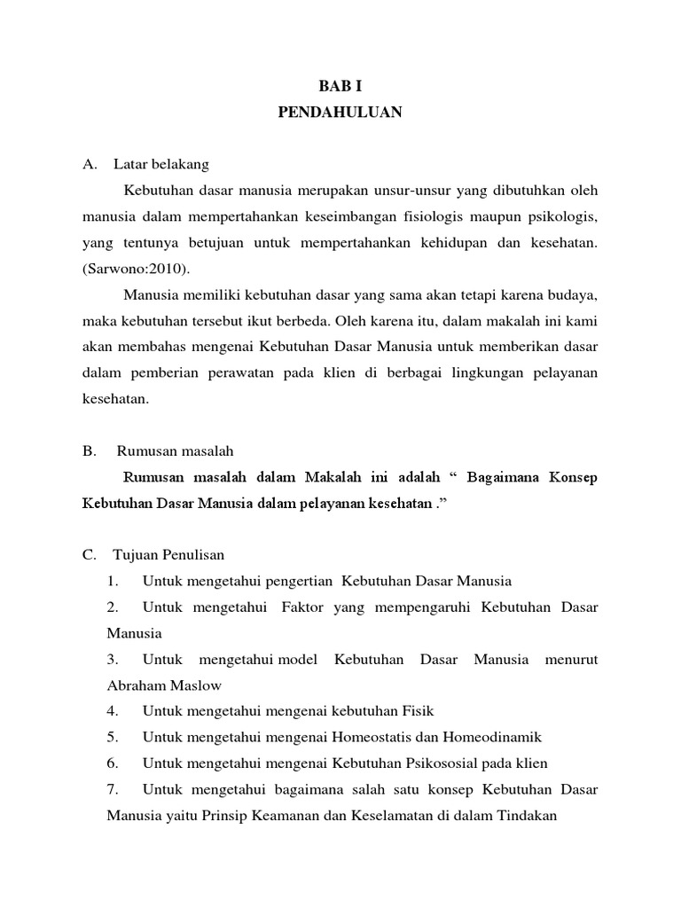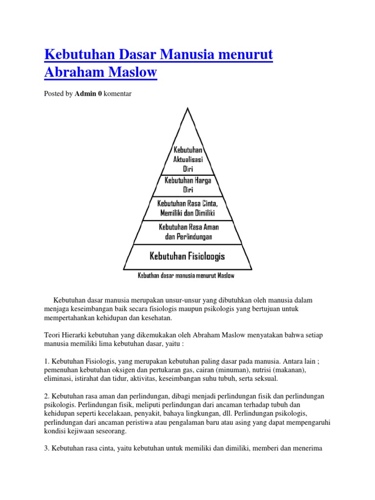 Makalah kebutuhan dasar manusia menurut abraham maslow. Manusia sebagai bagian integral yang berintegrasi satu sama lainnya dalam motivasinya memenuhi kebutuhan dasar fisiologis keamanan kasih sayang harga diri dan. Kebutuhan dasar manusia merupakan unsur unsur yang dibutuhkan oleh manusia dalam menjaga keseimbangan baik secara fisiologis maupun psikologis yang bertujuan untuk mempertahankan kehidupan dan kesehatan. Ia beranggapan bahwa kebutuhan kebutuhan di tingkat rendah harus terpenuhi atau paling tidak cukup terpenuhi terlebih dahulu sebelum kebutuhan kebutuhan di tingkat lebih tinggi menjadi hal yang memotivasi.