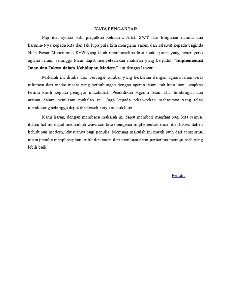 Iman dan taqwa sangat penting dalam kehidupan modern jika dalam kehidupan modern yang serba canggih tidak menghiraukan lagi keimanan dan ketaqwaan kepada allah maka akan banyak timbul problem dan tantangan yang terjadi baik dibidang ekonomi social agama maupun keilmuan itu sendiri. Dalam proses pendalaman materi ini tentunya kami mendapatkan bimbingan arahan koreksi dan saran untuk itu rasa terima kasih yang dalam dalamnya kami sampaikan kepada. Namun setelah mendapat imbuhan ke an maka kata tersebut bisa diartikan menjadi suatu nilai religius yang dimiliki oleh setiap muslim untuk cenderung melakukan segala hal sesuai dengan aturan yang diajarkan oleh allah dan rasul nya serta mengaplikasikan dalam kehidupan sehari hari sehingga kehidupan yang dijalaninya teratur.