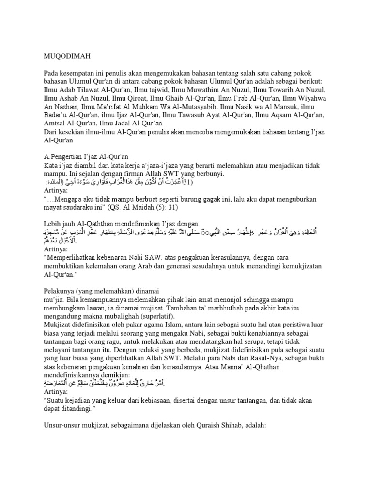 Makalah kemukjizatan al qur an. Al qur an adalah sihir perkataan ahli sya ir atau orang gila atau dongeng orang orang masa lampau sehingga telah nyata bahwasanya bangsa arab tidak sanggup menandingi kehebatan al qur an meskipun mereka pakar dalam bidang bahasa dan balaghah. Akan tetapi ia terletak pada dorongan untuk berpikir mengkaji meneliti dan menggunakan akal serta memperhatikan alam semesta. Salah satu objek penting lainya dalam kajian ulumul qur an adalah perbincangan mengenai mukjizat persoalan mukjizat terutama mukjizat al qur an sempat menyeret para teolog klasik dalam perdebatan yang berkepenjangan terutama antara teolog dari kalangan mu tazilah dan para teolog dari kalangan ahlussunnah mengenai konsep shirfah.