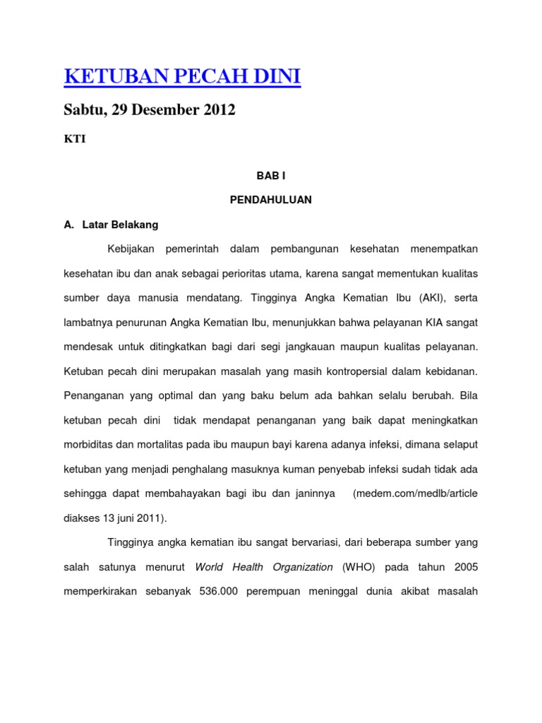 Ketuban pecah dini kpd merupakan pecahnya ketuban sebelum adanya tanda tanda persalinan. Ketuban pecah dini atau premature rupture of membranes prom adalah kondisi di mana kantung ketuban pecah sebelum waktu persalinan dimulai. Makalah ketuban pecah dini pdf.