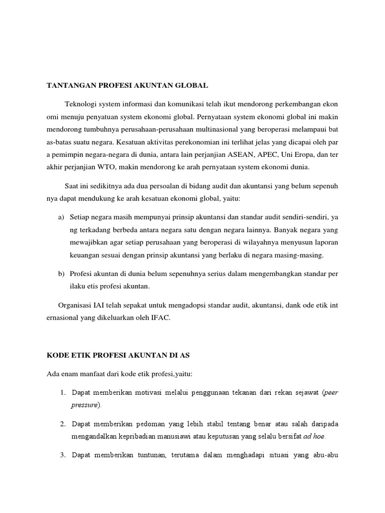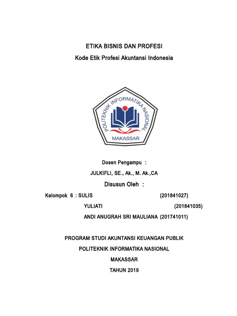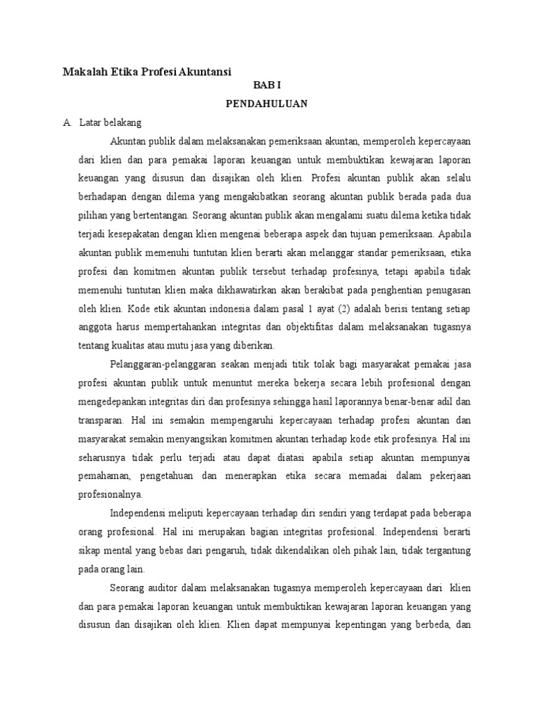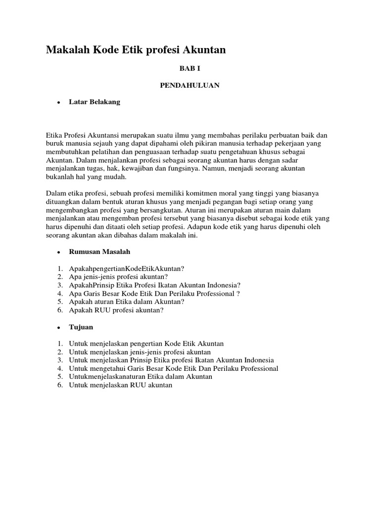 Makalah kode etik profesi akuntan indonesia. Dan juga kami berterima kasih pad a ibu meyta pritandhari m pd. 1 kode etik profesi akuntan publik iapi institut akuntan publik indonesia oktober 2008 diterjemahkan dengan modifikasi dari code of ethics for professional accountants yang ditetapkan oleh international ethics standards board for accountants iesba seperti yang tercantum dalam handbook of international auditing assurance and ethic pronouncements 2008 edition yang dikeluarkan. 2 1 definisi kode etik profesi dan kode etik akuntan indonesia kode etik profesi merupakan sarana untuk membantu para pelaksana seseorang sebagai seseorang yang professional supaya tidak dapat merusak etika profesi.