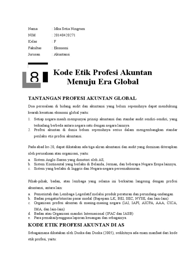 Kode etik profesi akuntan menuju era global untuk memenuhi tugas mata kuliah etika bisnis dan profesi nama kelompok 10. Tantangan profesi akuntan global kode etik akuntan di as enam manfaat dari kode etik profesi yaitu. Kode etik profesi akuntan menuju era global makalah diajukan sebagai tugas matakuliah etika bisnis dan profesi dosen pengampu.