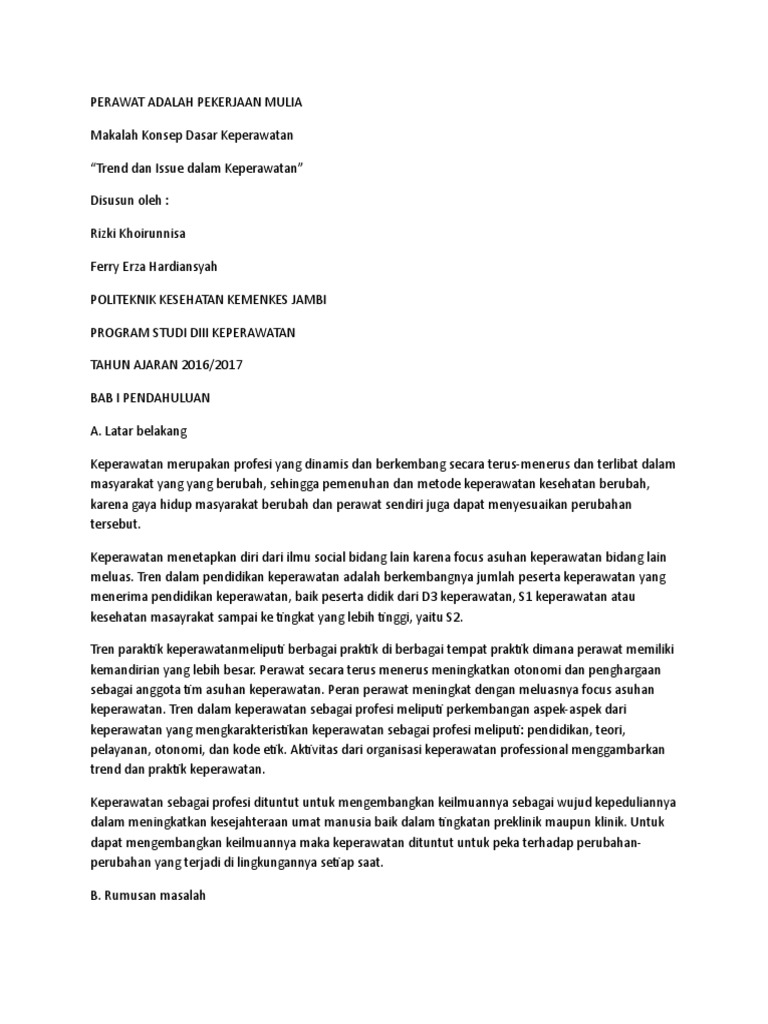 Makalah konsep dasar keperawatan nama farikhana azka adibah stikes kepanjen pem kab malang d3 1 b keperawatan 2015 kata pengantar puji syukur kami ucapkan ke hadirat allah swt dengan rahmat serta karunia nya sehingga makalah ini dapat kami selesaikan. Pendahuluan pelayanan keperawatan sebagai pelayanan professional merupakan pelayanan yang bersifat humanistic dilaksanakan berdasarkan ilmu dan kiat yang berorientasi pada kebutuhan obyektif klien baik secara individu keluarga kelompok komunitas. Angraeni 320 10 071 8mustika 320 10 072 9.