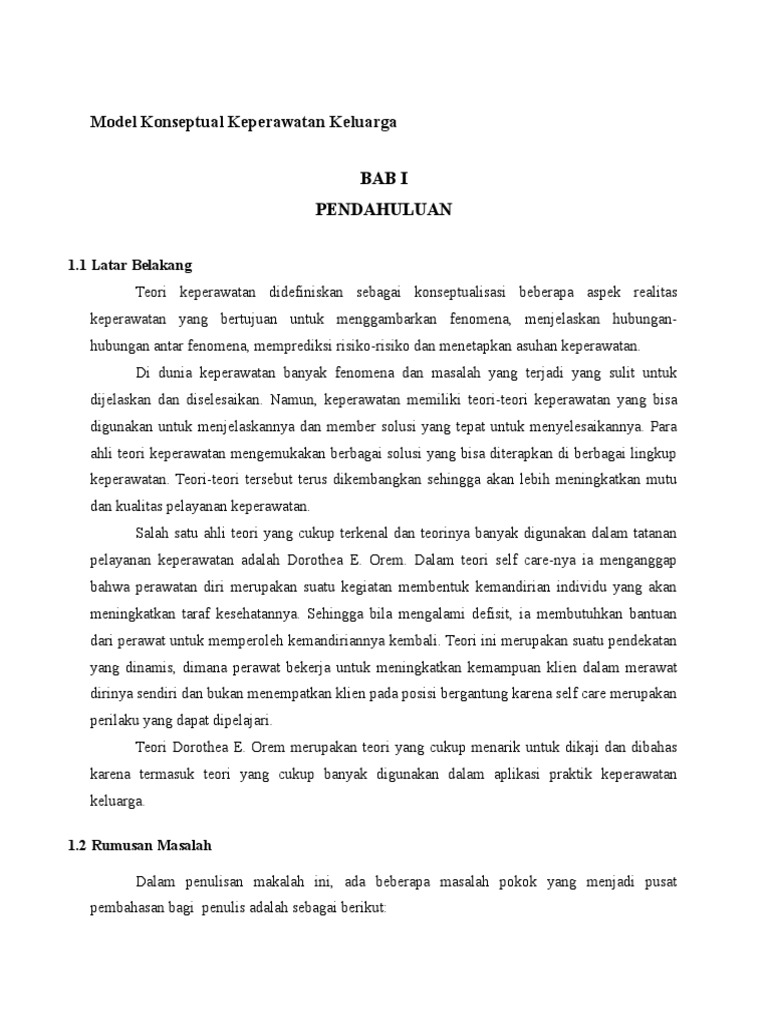 Penulis mengucapkan terima kasihpada semua pihak yang telah membantu dalam pembuatan makalah ini. Orem mengembangkan model konsep keperawatan ini pada awal tahun 1971 dimana dia mempublikasikannya dengan judul nursing conceps of practice self care. Perawatan keluarga yang komprehensip merupakan suatu proses yang rumit sehingga memerlukan suatu pendekatan yang logis dan sistematis untuk bekerja dengan keluarga dan anggota keluarga.