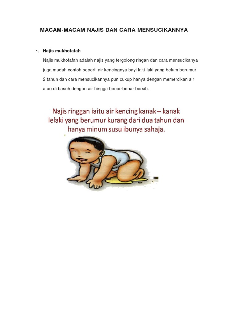 Macam macam najis dan cara mensucikannya sebelum melakukan segala bentuk ibadah ada baiknya untuk mensucikan diri terlebih dahulu dari segala kotoran atau najis najis adalah kotoran yang menjadi penyebab terhalangnya ibadah yang dilakukan oleh seseorang hingga ibadahnya menjadi tidak sah yang dilakukan bila badan terkena najis. Thaharah secara hakiki bisa didapat dengan menghilangkan najis yang menempel baik pada badan pakaian atau tempat untuk melakukan ibaadah ritual caranya bermacam macam tergantuk level kenajisannya bila najis itu ringan cukup dengan memercikan air saja maka najis itu dianggap sudah lenyap bila najis itu berat harus dicuci dengan air 7 kali dan salah satunya dengan tanah. Makalah pembagian najis dan cara mensucikannya docx.