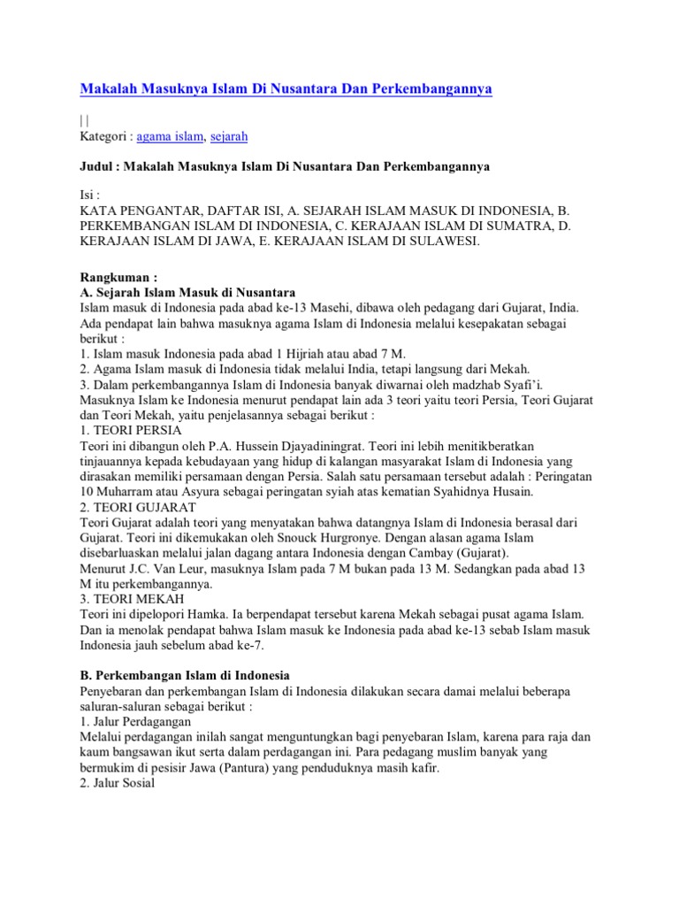 Untuk memperjelas hal tersebut makalah ini berusaha menguak sejarah awal masuk dan berkembangnya islam di indonesai mulai dari teorinya cara mengislamkan penduduk indonesia hingga perkembangannya di nusantara. Di lihat dari proses masuk dan berkembangnya agama islam di indonesia ada tiga teori yang berkembang. Teori gujarat teori makkah dan teori persia ahmad mansur 1996.