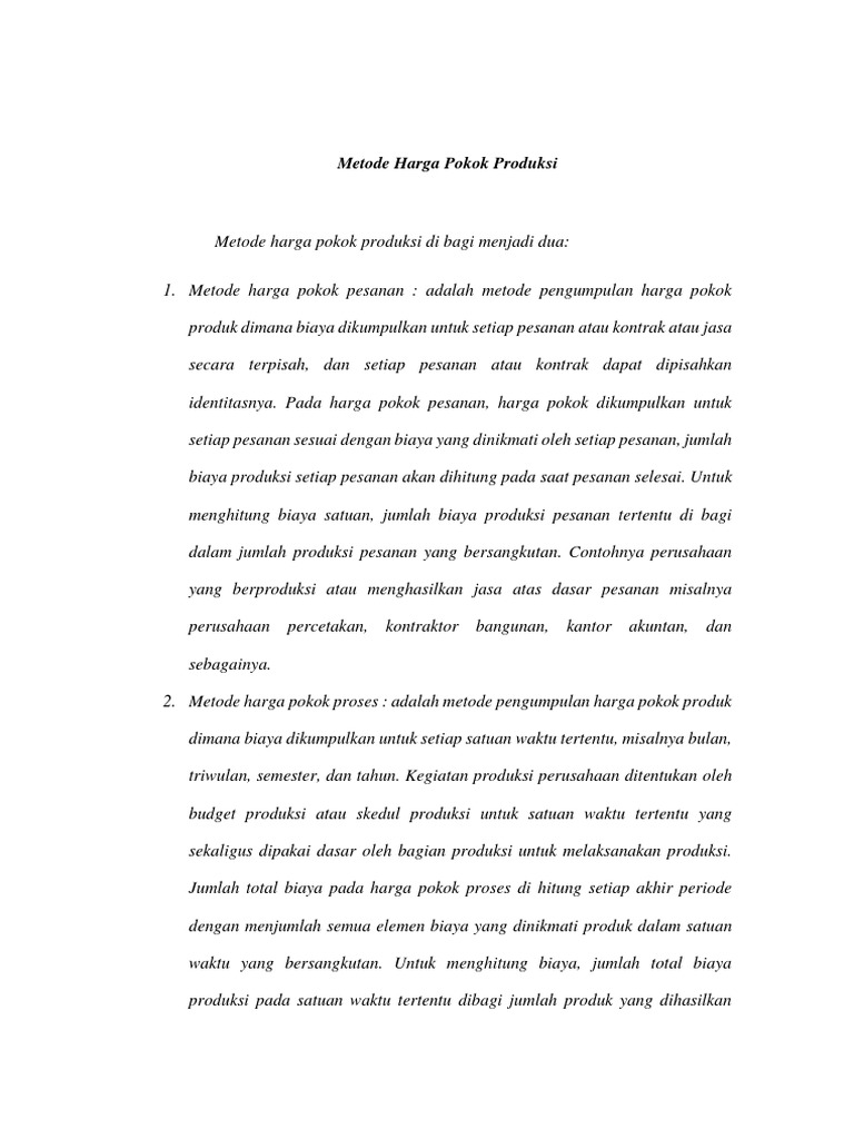 Makalah metode harga pokok proses. Makalah metode harga pokok pesanan dan harga pokok proses. Dengan demikian kami berharap makalah ini dapat memenuhi tugas tersebut dan mampu membuat pembaca memahami lebih lanjut tentang proses siklus akuntansi biaya untuk menentukan harga pokok produk dengan menggunakan metode full costing. Metode harga pokok proses dietrapkan untuk mnegolah informasi biaya produksi dalam perusahaan yang produksinya dilaksanakan secara massa.