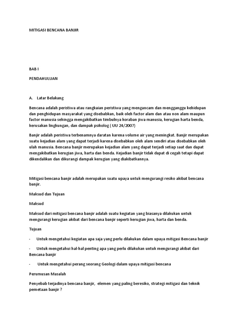 Dalam makalah ini dibahas mengenai pengertian banjir penyebab banjir penanggulangan banjir dan bagaimana mitigasinya apabila banjir melanda. Mitigasi dalam bencana banjir terbagi menjadi 2 macam yaitu mitigasi secara struktural dan mitigasi secara non struktural. Jadi mitigasi bencana banjir adalah upaya yang dilakukan untuk mencegah atau mengurangi resiko dari bencana banjir.