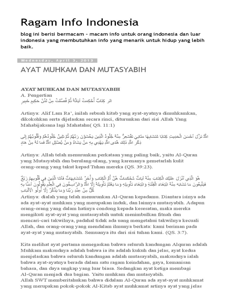 Makalah muhkam dan mutasyabih pdf. Kesimpulan dari uraian ayat ayat muhkam dan mutasyabih diatas dapat dipahami sebagai berikut. In a study of qur 39 anic studies the theme of muhkam and mutasyabih a central theme. Menurut yusuf qardhawi adanya muhkam dan mutasyabih sebenarnya merupakan ke mahabijaksanaan nya allah bahwa al qur an ditujukan kepada semua kalangan karena bagi orang yang mengetahui berbagai tabiat manusia di antara mereka ada yang senang terhadap bentuklahiriyah dan telah merasa cukup dengan bentuk literal suatu nash.