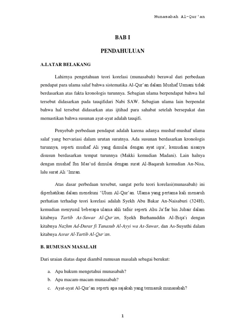 Lahirnya pengetahuan tentang korelasi munasabah ini berawal dari kenyataan bahwa sistimatikan al qur an sebagaimana terdapat dalam mushaf utsmani sekarang tidak berdasarkan pada kronologis turunnya itulah sebabnya terjadi perbedaan pendapat di kalangan ulama salaf tentang urutan surat dalam al qur an. Baidowi muhammad kudus faisol koroni abdul hafiz abdul rosyid yayasan ma arif syaichona moh. Munasabah al qur an makalah disusun oleh.