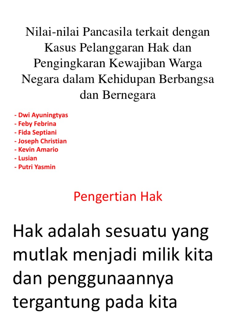 Mengembangkan sikap saling menghargai antar suku agama ras dan antar golongan. Makalah ini dibuat untuk memberitahukan kepada para pembaca tentang apa apa saja yang bersangkutan dengan judul makalah kami kali ini misalnya seperti pengertian hak pengertian kewajiban macam macam hak bentuk pelanggarannya bentuk pengingkaran kewajibannya serta cara menyelesaikannya. Nilai dasar pancasila ketuhanan.