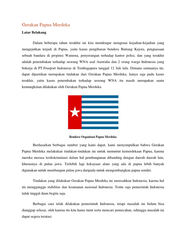 Makalah organisasi papua merdeka. Pengertian organisasi papua merdeka opm organisasi papua merdeka opm adalah sebuah organisasi yang dibentuk pada tahun 1965 dengan tujuan membantu dan melaksanakan penggulingan pemerintahan yang saat ini berdiri di provinsi papua dan papua barat di indonesia sebelumnya bernama irian jaya memisahkan diri dari indonesia dan menolak pembangunan ekonomi dan modernitas. Pengertian organisasi papua merdeka opm organisasi papua merdeka opm adalah sebuah organisasi yang dibentuk pada tahun 1965 dengan tujuan membantu dan melaksanakan penggulingan pemerintahan yang saat ini berdiri di provinsi. Pembentukan organisasi papua merdeka opm pada tahun 1963 menjadi salah satu jalan merekauntuk mencapai kemerdekaan mereka dari indonesia.