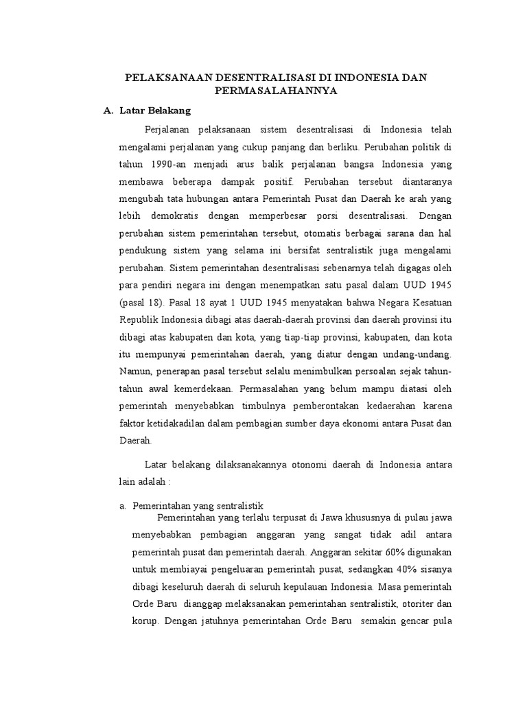 Makalah otonomi daerah dan permasalahannya. 32 tahun 2004 pasal 1 ayat 5 pengertian otonomi daerah adalah hak wewenang dan kewajiban daerah otonom untuk mengatur dan mengurus sendiri urusan pemerintah dan kepentingan masyarakat setempat sesuai dengan peraturan perundang undangan selain itu menurut suparmoko 2002 61 mengartikan otonomi daerah adalah kewenangan daerah otonomi untuk mengatur dan mengurus kepentingan. Rizky argama desember 2005 1 bab i pendahuluan 1 1 latar belakang pada masa sebelum 1998 kekuasaan pemerintah pusat negara. Oto nomi dae rah diharapkan bi sa men do rong lahirnya para elite birokrat yang profesional me wujudkan ta ta kelola pe me rin tahan yang ber sih dan me ning katkan kua li tas pela.