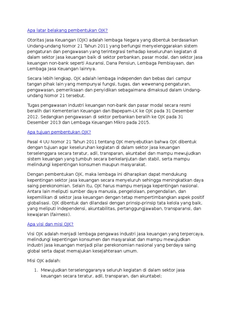 Penulis juga tidak lupa mengucapkan banyak terima kasih kepada dosen dan pihak yang telah membimbing penulis dalam menyelesaikan makalah ini. Ojk adalah otoritas jasa keuangan yang menurut uu no 21 tahun 2011 fungsi tugas dan wewenang pengaturan dan pengawasan kegiatan jasa keuangan di sektor microprudential beralih dari bi bank indonesia ke ojk otoritas jasa keuangan. Sementara itu menurut undang undang republik indonesia nomor 21 tahun 2011 tentang otoritas jasa keuangan bab 1 pasal 1 pengertian ojk adalah otoritas jasa keuangan yang selanjutnya disingkat ojk adalah lembaga yang independen dan bebas dari campur tangan pihak lain yang mempunyai fungsi tugas dan wewenang pengaturan pengawasan pemeriksaaan dan penyidikan sebagaimana dimaksud dalam.