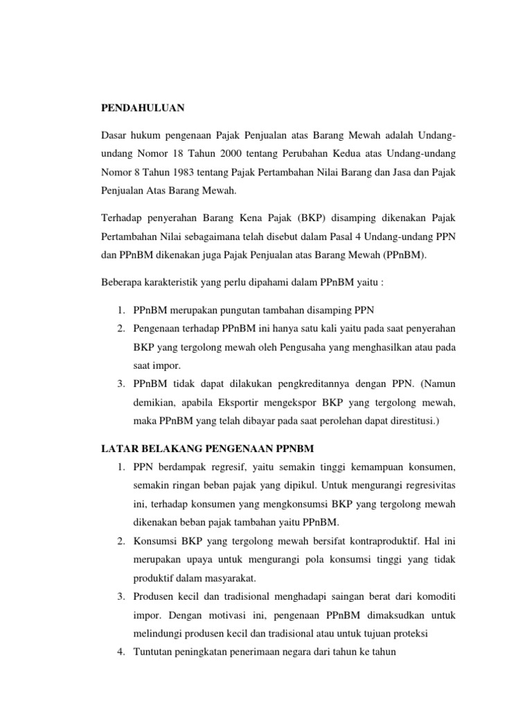 Dasar hukum pengenaan pajak penjualan atas barang mewah adalah undang undang nomor 18 tahun 2000 tentang perubahan kedua atas undang undang nomor 8 tahun 1983 tentang pajak pertambahan nilai barang dan jasa dan pajak penjualan atas barang mewah. Mungkin karena itu kedua jenis pajak tersebut diatur dalam. Pada dasarnya semua barang dan jas merupakan barang kena pajak dan jasa kena pajak sehingga dikenai ppn kecuali jenis barang dan jenis jasa sebagaimana ditetapkan dalam pasal 4a uu no 8 1983 tentang pajak pertambahan nilai barang dan jasa dan pajak penjualan atas barang mewah sebagimana telah beberapa kali diubah terakhir dengan undang undang no 18 2000 tidak dikenai ppn yaitu.