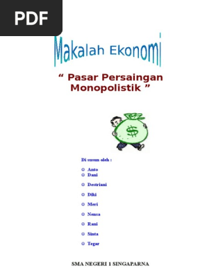 Makalah pasar persaingan monopolistik pdf. Bentuk pasar persaingan monopolistik adalah keadaan biasa yang ekstrim sebagian besar operasi operasi eceran berada dalam bentuk pasar ini bisnis bisnis kecil dari seluruh sektor jatuh dalam pasar kategori ini memulai suatu bisnis secara relatif adalah mudah tetapi untuk tetapbertahan dalam bisnis tersebut adalah tidak mudah. Produsen yang memiliki modal sedikit dan mempunyai pengalaman yang kurang akan cepat berpindah pada pasar ini. Namun dilihat dari segi sifatnya banyak sekali pasar pasar yang cenderung ke arah pasar persaingan monopolistik karena pada dasarnya sulit sekali.